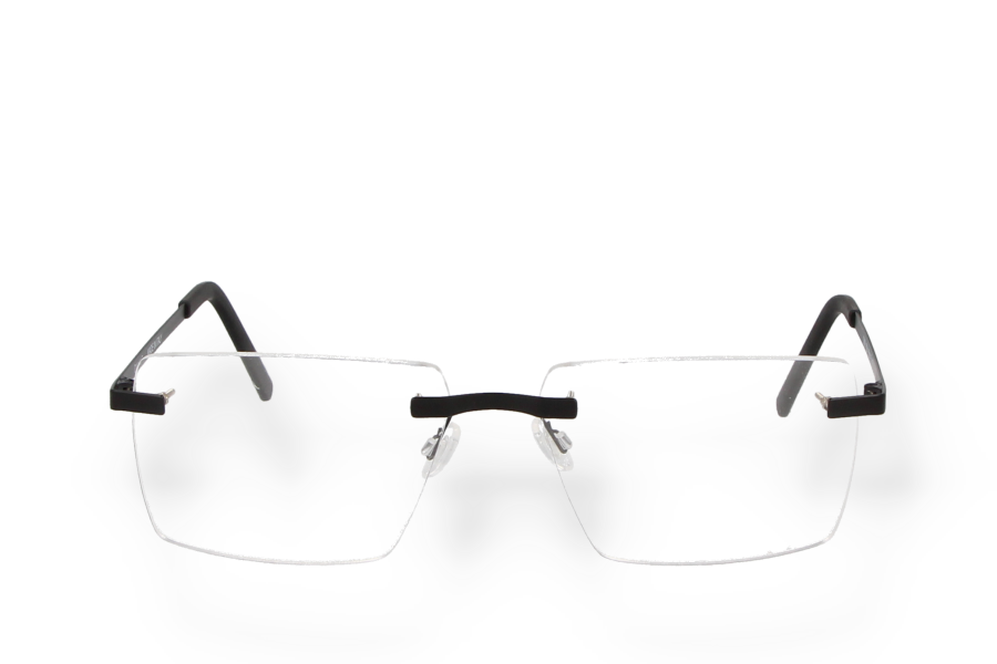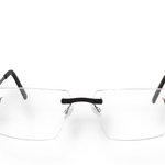 This geometric rimless optical frame features a refined matte black stainless steel front with matching temples and silver accents. The clean lines and featherlight structure ensure maximum comfort without compromising on durability. Sleek and modern, it embodies contemporary Italian design with precision engineering, ideal for those who value subtle sophistication and flawless craftsmanship.