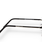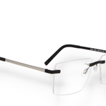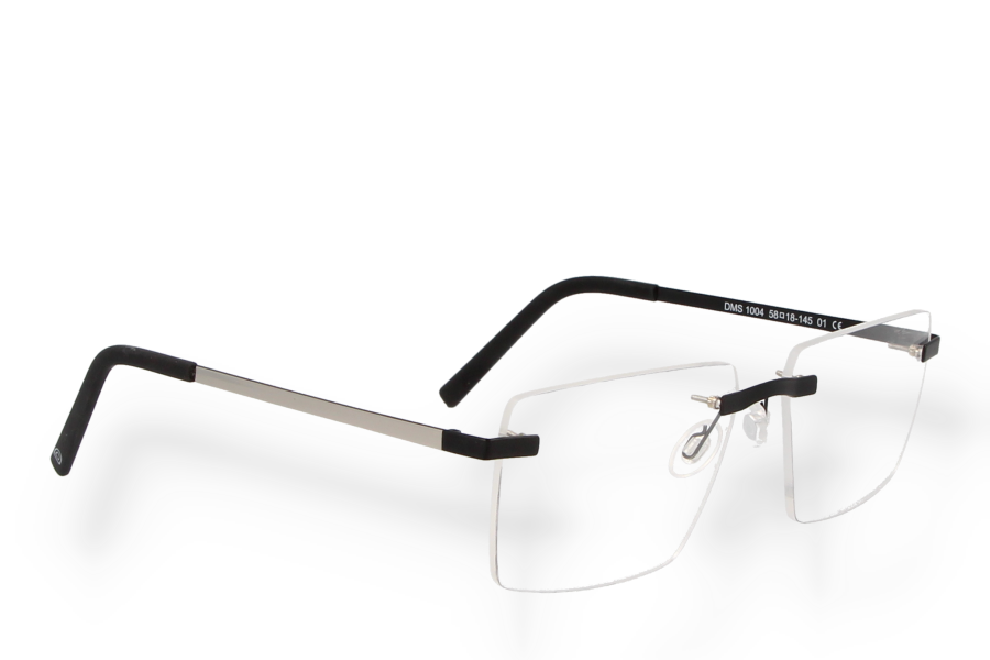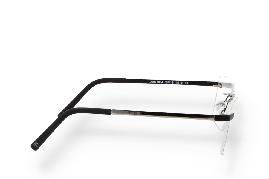 DMS 1004 01 - Geometric rimless optical frame with matte black stainless steel temples and silver details. Minimal, lightweight, and perfectly balanced for everyday wear.