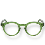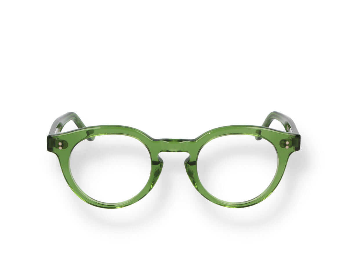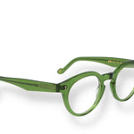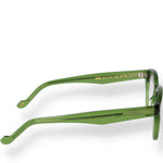 This round optical frame features green Mazzucchelli acetate with matching temples and transparent lenses. The rich color adds personality to its minimalist design, blending creativity and elegance in perfect harmony. Entirely made in Italy, it expresses individuality and craftsmanship through a modern, playful aesthetic.