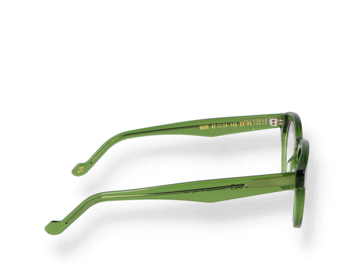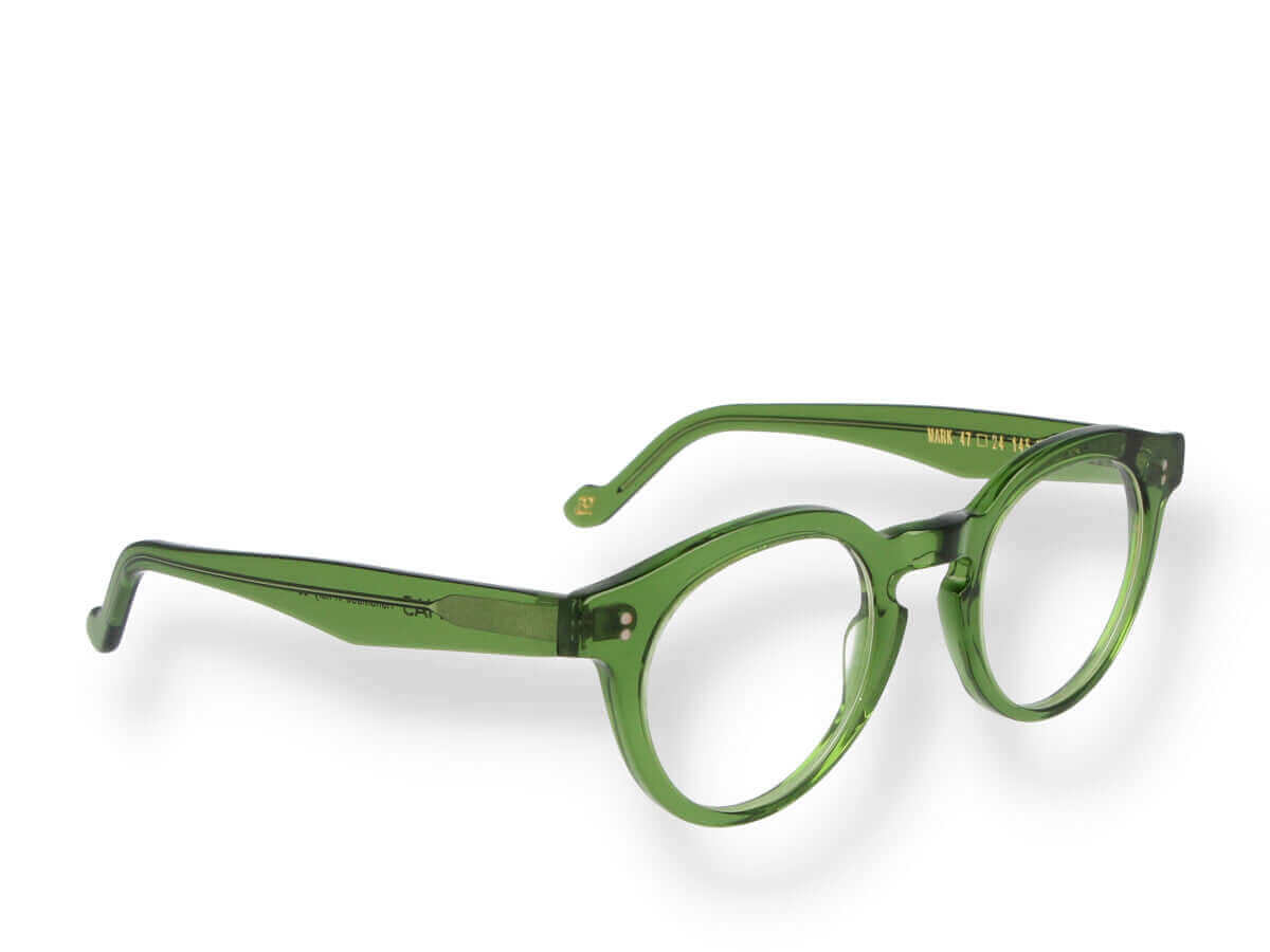 MARK 69 69 round optical frame with green Mazzucchelli acetate temples and transparent lenses. Vibrant and distinctive, it brings fresh energy to a classic shape.