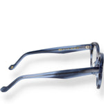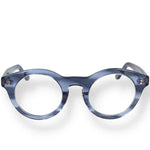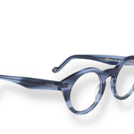 This round optical frame is made of blue Mazzucchelli acetate with matching temples and transparent lenses. The cool tone adds a contemporary twist to the traditional round design, offering personality and versatility in one. Handcrafted in Italy, it reflects a modern spirit that stands out with understated elegance.