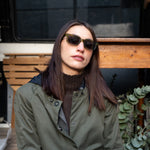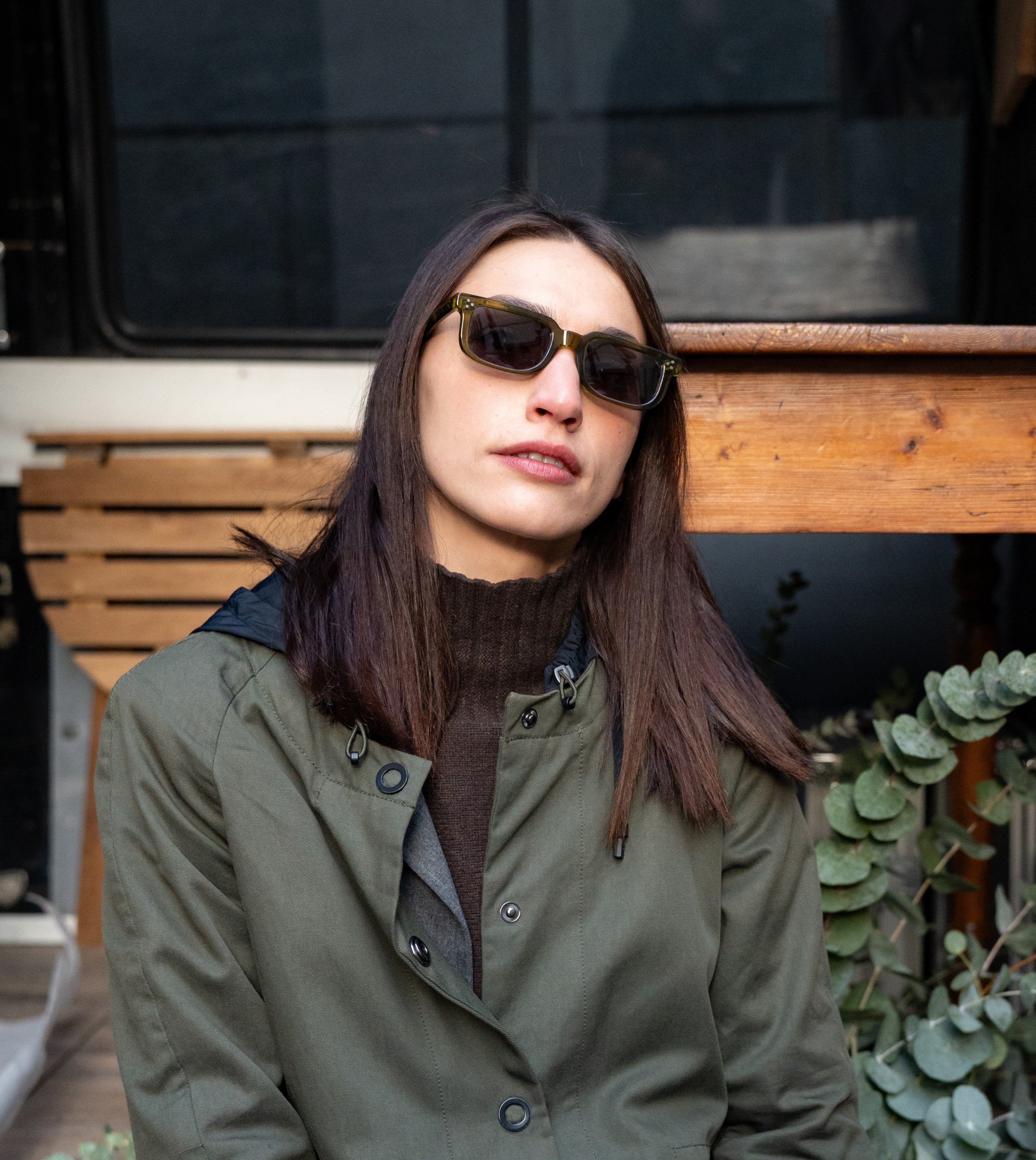 These rectangular sunglasses combine olive green Mazzucchelli acetate frames and temples with smoke lenses, creating a bold yet natural aesthetic. The earthy hue and structured silhouette reflect Italian craftsmanship with a modern twist. Balanced, versatile, and effortlessly cool, they add a contemporary edge to casual or polished looks alike.
