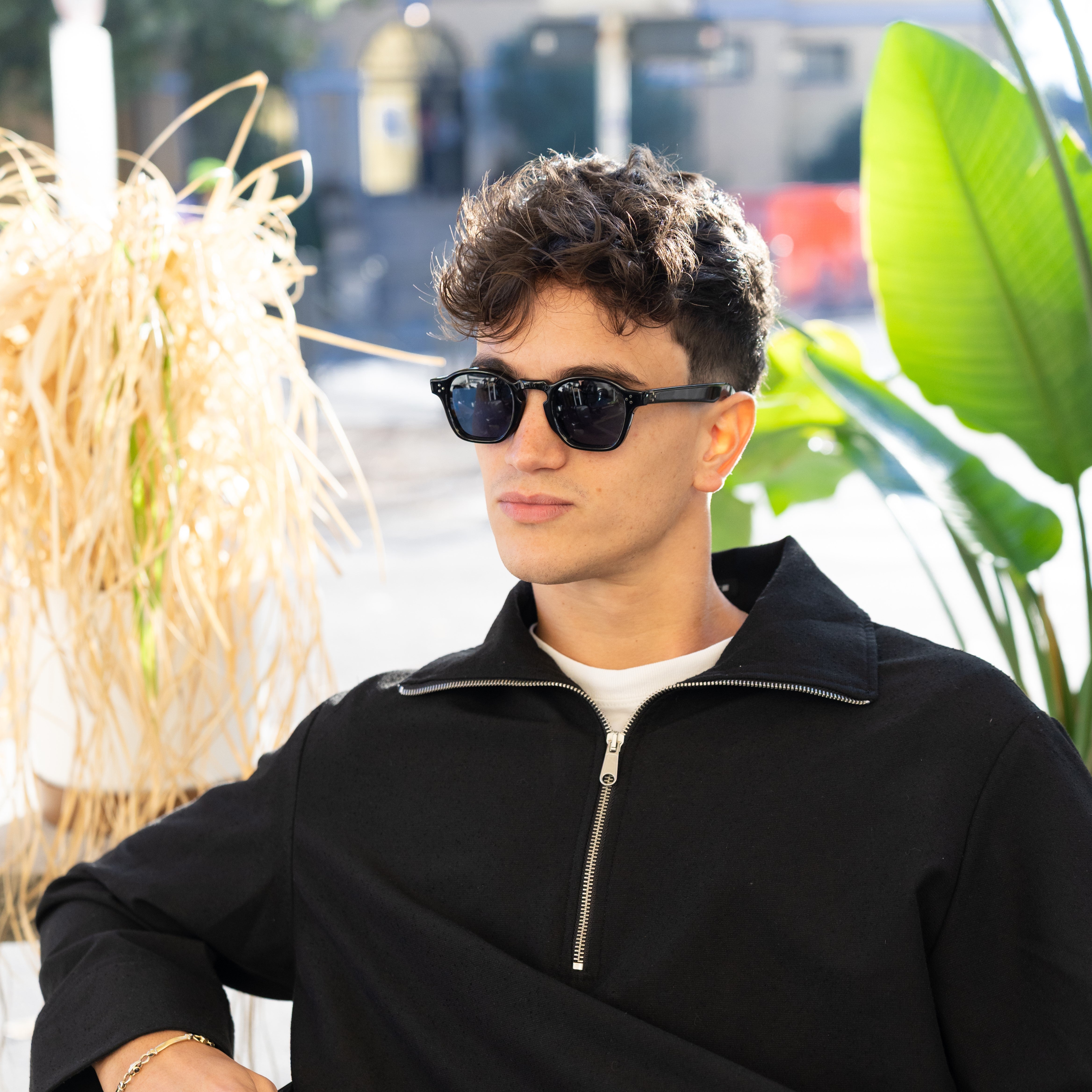 These round sunglasses feature a bold design in black Mazzucchelli acetate with matching temples and deep blue lenses. The rich contrast between the glossy frame and the cool-toned lenses creates a refined yet modern aesthetic. Meticulously crafted in Italy, they combine comfort, durability, and style — the perfect balance between classic inspiration and urban sophistication.