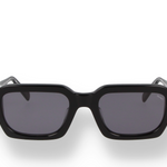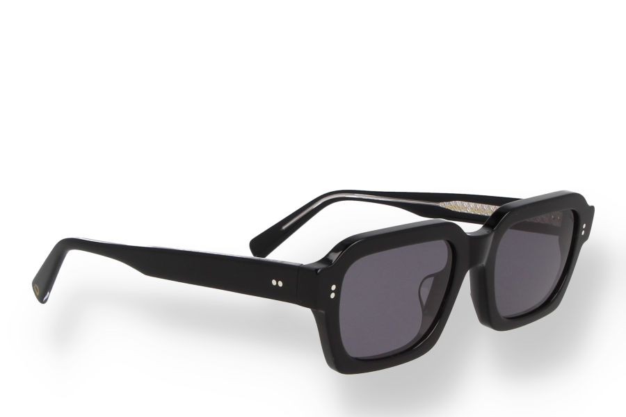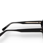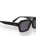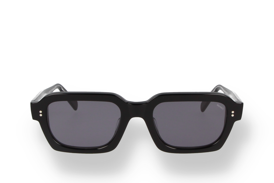 These geometric sunglasses are crafted in sleek black Mazzucchelli acetate with matching temples and smoke lenses. The angular design and solid color palette highlight a strong, confident aesthetic, perfectly balanced by refined Italian craftsmanship. Modern yet classic, they embody understated sophistication with every wear.