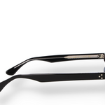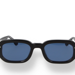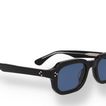 These geometric sunglasses feature a striking black Mazzucchelli acetate frame with matching temples and blue lenses. The crisp shape and vivid lens color create a confident, contemporary balance of structure and vibrancy. Made in Italy with precision, they offer a perfect fusion of style, comfort, and craftsmanship — a versatile essential for everyday elegance.