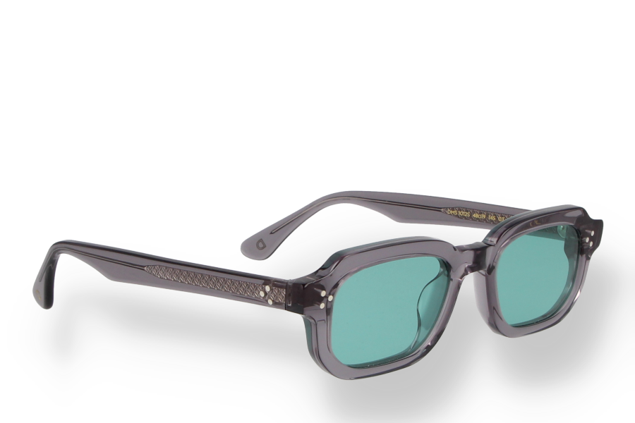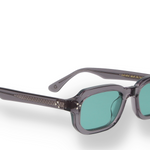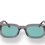 These geometric sunglasses showcase transparent grey Mazzucchelli acetate with matching temples and vibrant aqua azure lenses. The interplay between clarity and color lends a refreshing, futuristic edge to the design. Refined yet daring, they express individuality with a cool, luminous finish — the perfect statement piece for the modern trendsetter.