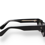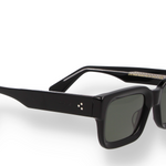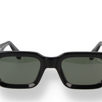 These rectangular sunglasses feature a bold black Mazzucchelli acetate frame with matching temples and classic green lenses. The clean, architectural silhouette gives a sharp yet timeless character, enhanced by the depth of the dark hue. Handcrafted in Italy, they offer a refined statement piece that merges modern minimalism with enduring style.