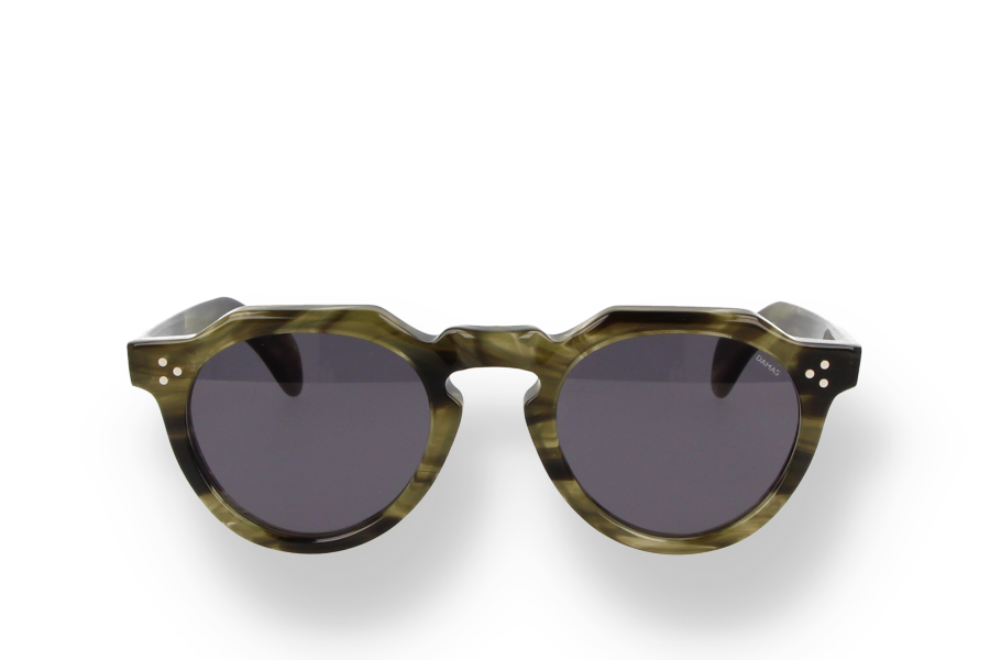 DMS 1014S 03 - Round sunglasses with olive horn Mazzucchelli acetate temples and smoke lenses. Distinctive texture and soft tones define understated sophistication.