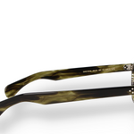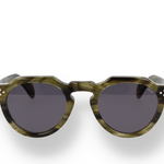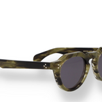 These round sunglasses feature olive horn Mazzucchelli acetate frames with coordinated temples and smoke lenses. The subtle marbled finish gives depth to the structure, enhancing its natural, organic appeal. Stylish and versatile, they reflect the artistry of Italian craftsmanship — the perfect companion for a polished, effortless look.
