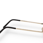 These oval rimless sunglasses feature a light gold stainless steel frame with matching temples and vibrant blue lenses. The ultra-slim design enhances the clean, modern silhouette, offering a lightweight fit and subtle radiance. Unisex and contemporary, they blend timeless elegance with technical precision, a true expression of Italian craftsmanship and modern versatility.