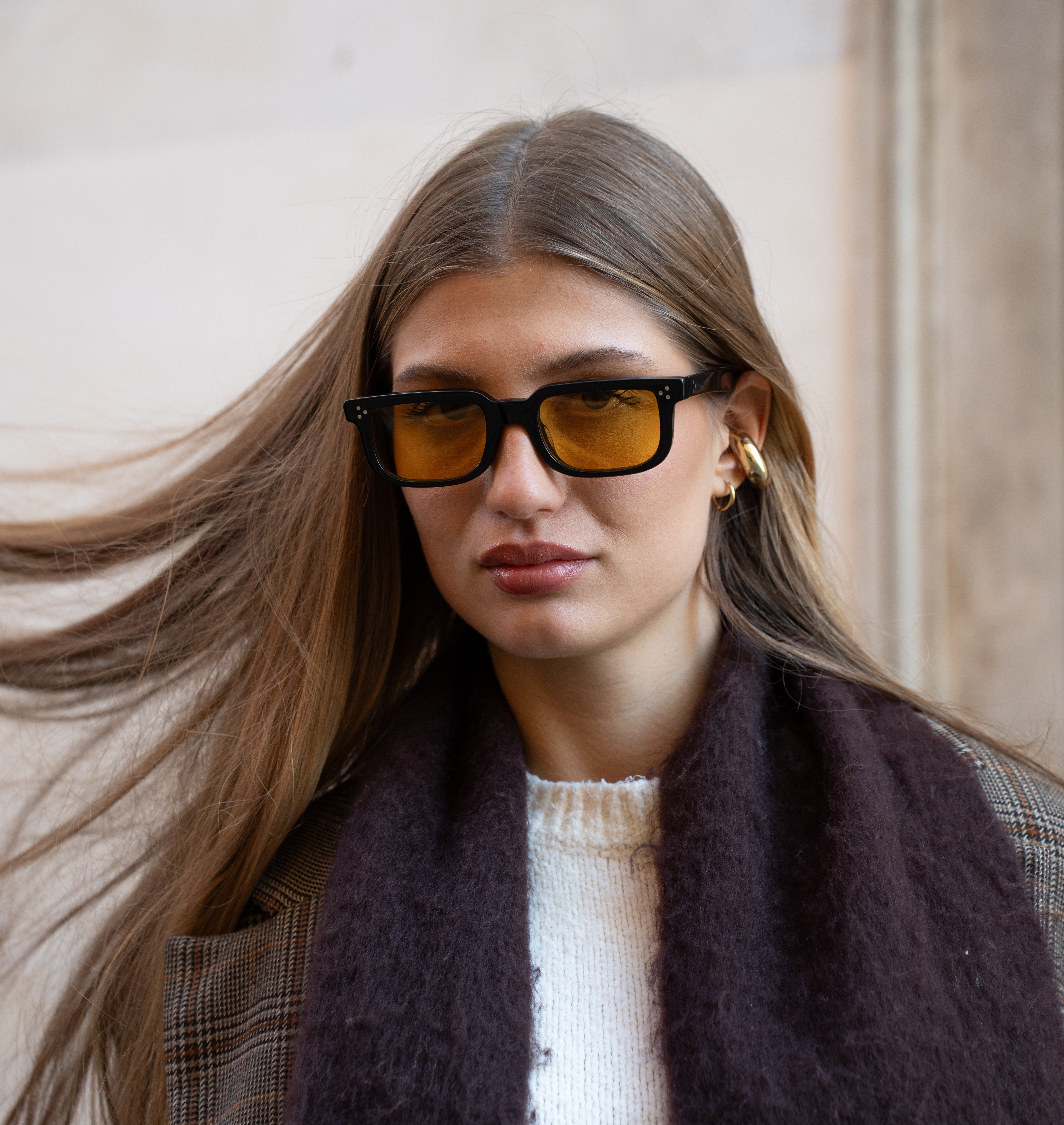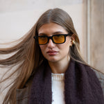 Questi occhiali da sole rettangolari presentano un design raffinato, realizzati in pregiato acetato Mazzucchelli nero con aste abbinate e lenti color ambra caldo. Il vivace contrasto tra montature scure e tonalità dorate conferisce un tocco distintivo, mentre l'acetato leggero garantisce comfort e resistenza. Sicuri e moderni, donano un tocco di carattere immediato a qualsiasi outfit.