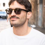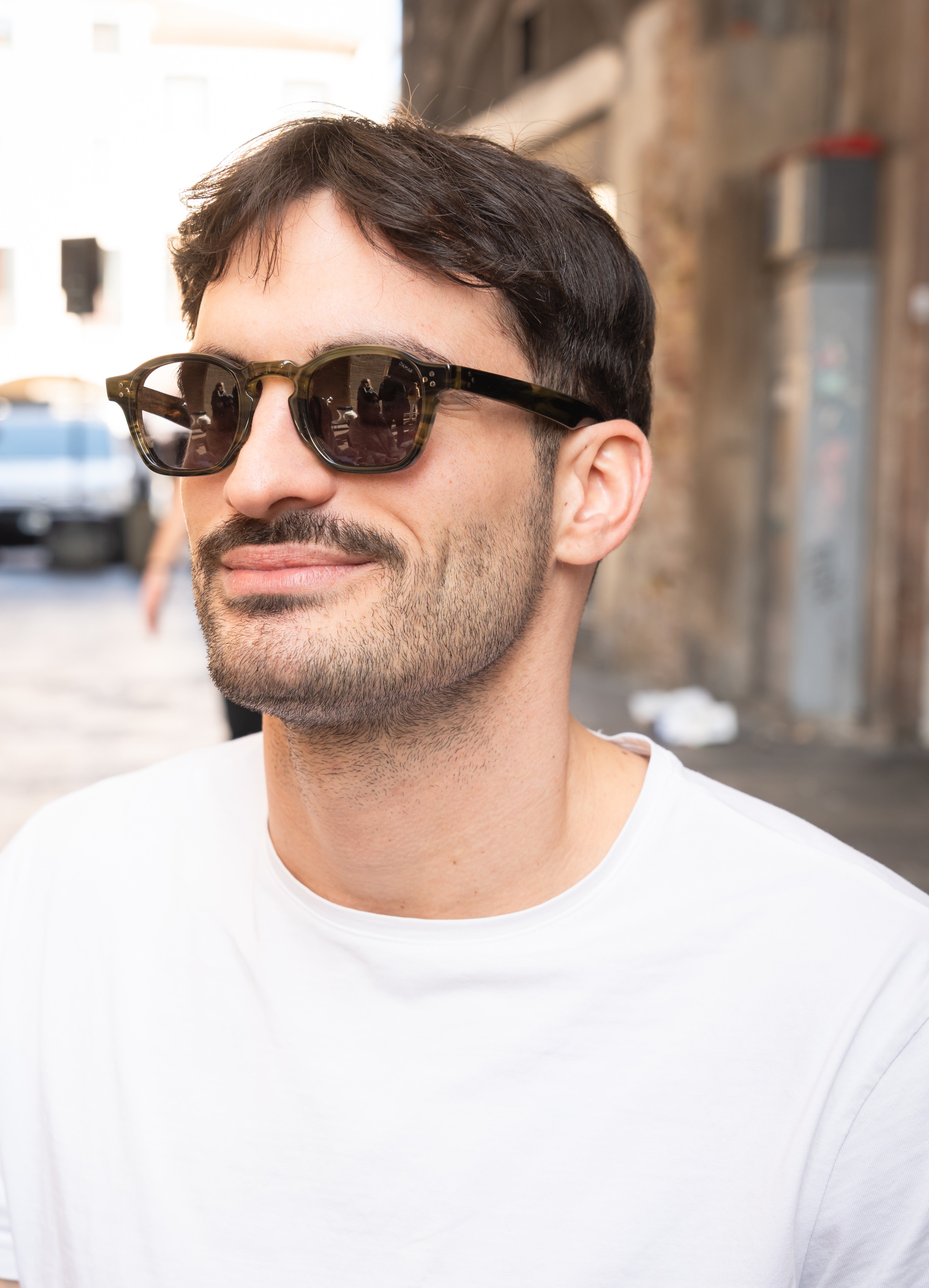 Questi occhiali da sole rotondi sono realizzati in acetato Mazzucchelli color corno d'ulivo con aste abbinate e lenti grigio fumé. La delicata variazione di tonalità esalta la qualità artigianale della montatura, mentre la silhouette circolare aggiunge una personalità decisa ma sobria. Eleganti e versatili, catturano l'essenza del design italiano con un tocco moderno e naturale.