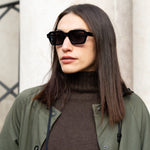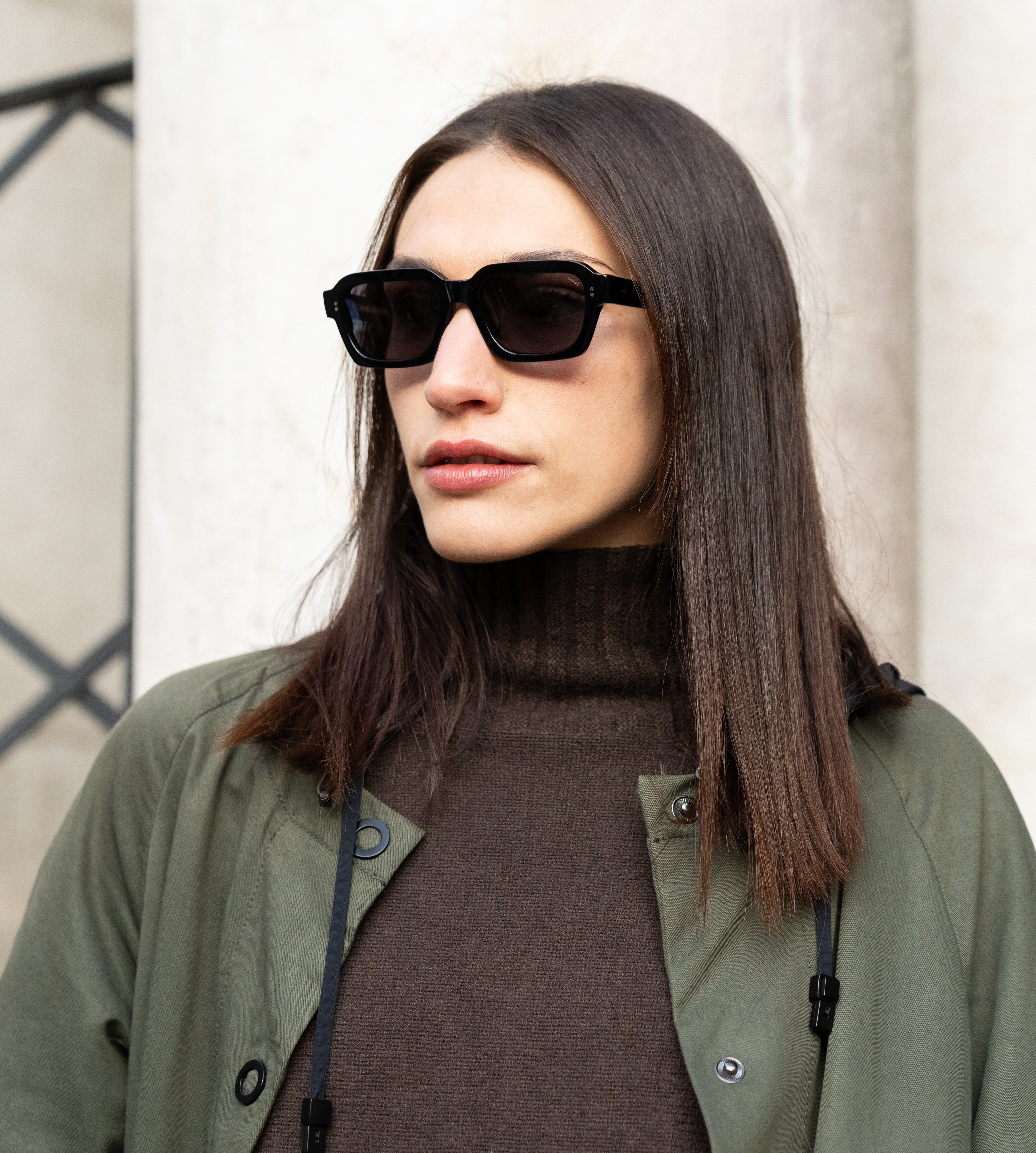 Questi occhiali da sole geometrici sono realizzati in elegante acetato Mazzucchelli nero con aste abbinate e lenti fumé. Il design spigoloso e la palette di colori a tinta unita esaltano un'estetica decisa e decisa, perfettamente bilanciata dalla raffinata artigianalità italiana. Moderni ma classici, incarnano una sobria raffinatezza ad ogni utilizzo.