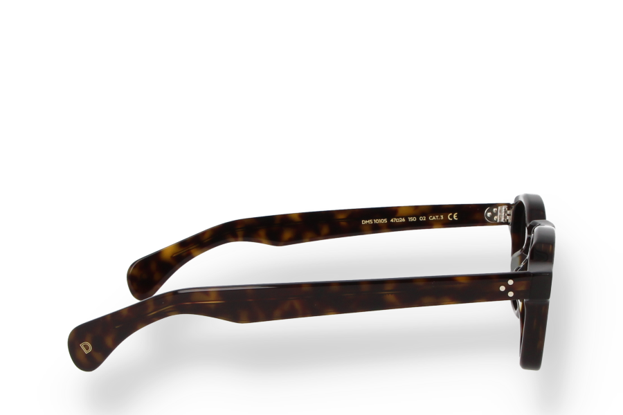 DMS 1010S 02 - Round sunglasses with dark havana Mazzucchelli acetate temples and green lenses. Warm and elegant, they blend vintage charm with contemporary flair.